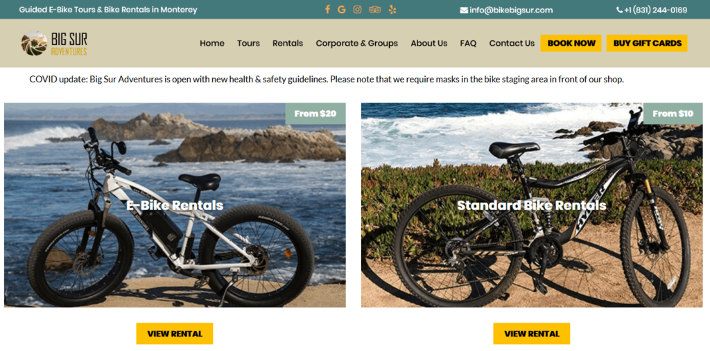 Bikes are a perfect product to then also offer rentals as you can see with Big Sur Adventures(opens in a new tab) who have both traditional and electric bicycles.