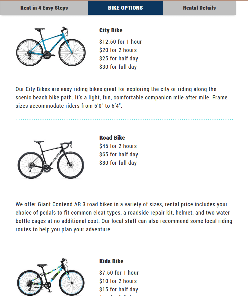 The Bike Center(opens in a new tab) have an excellent rental setup which includes photos of the different types of bikes with descriptions and the price for various rental times.
