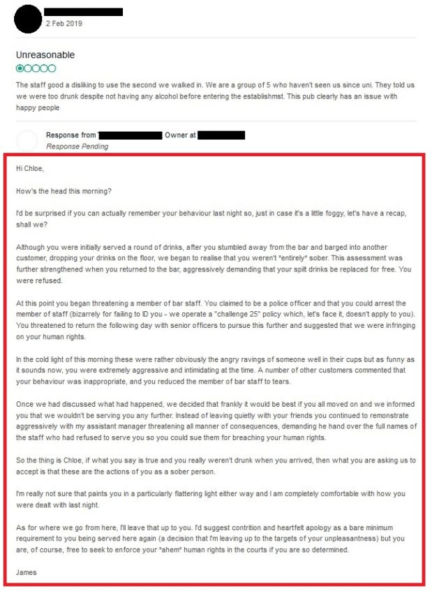 What would have been a better answer: “The wellbeing of our staff but also of our customers is extremely important to us. We do apologize if you feel as though our staff misjudged the situation. At times, we make a judgement call to stop serving as we see it as our personal and legal responsibility to do our part to ensure all of our customers get home safely. We are always open for happy customers and would love to have you back, as I’m sure you’ll see we also love a good party.”