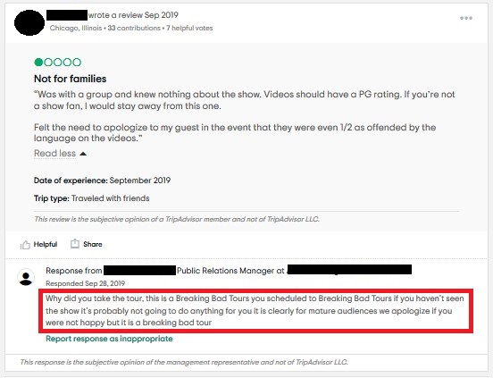 What would have been a better answer: “We’re sorry you did not enjoy this tour and if you were offended by the material. As this tour is about Breaking Bad, in general, we expect that people who take our tour are either fans of, or familiar with the show and therefore have a certain level of expectation with its material.”